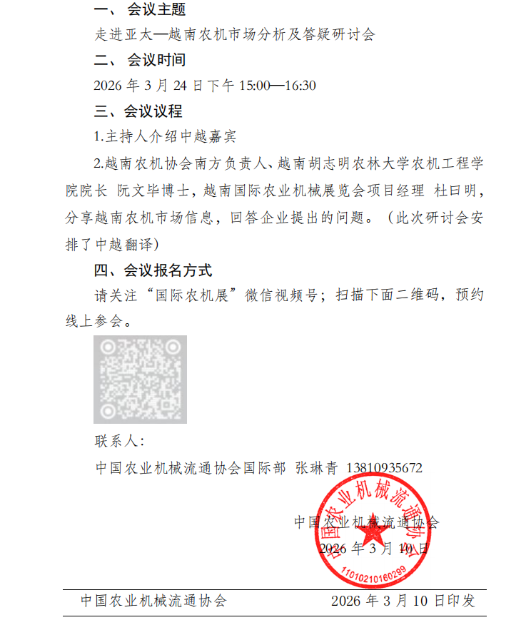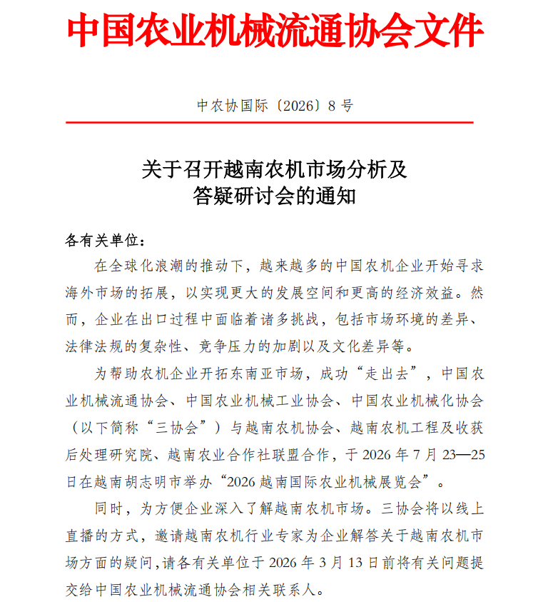 为方便企业深入了解越南农机市场,三协会将于2026年3月24日下午15:00-16:30以线上直播的方式,邀请越南农机行业专家为企业解答关于越南农机市场方面的疑问。请各有关单位于2026年3月13日前将有关问题提交给中国农业机械流通协会相关联系人。