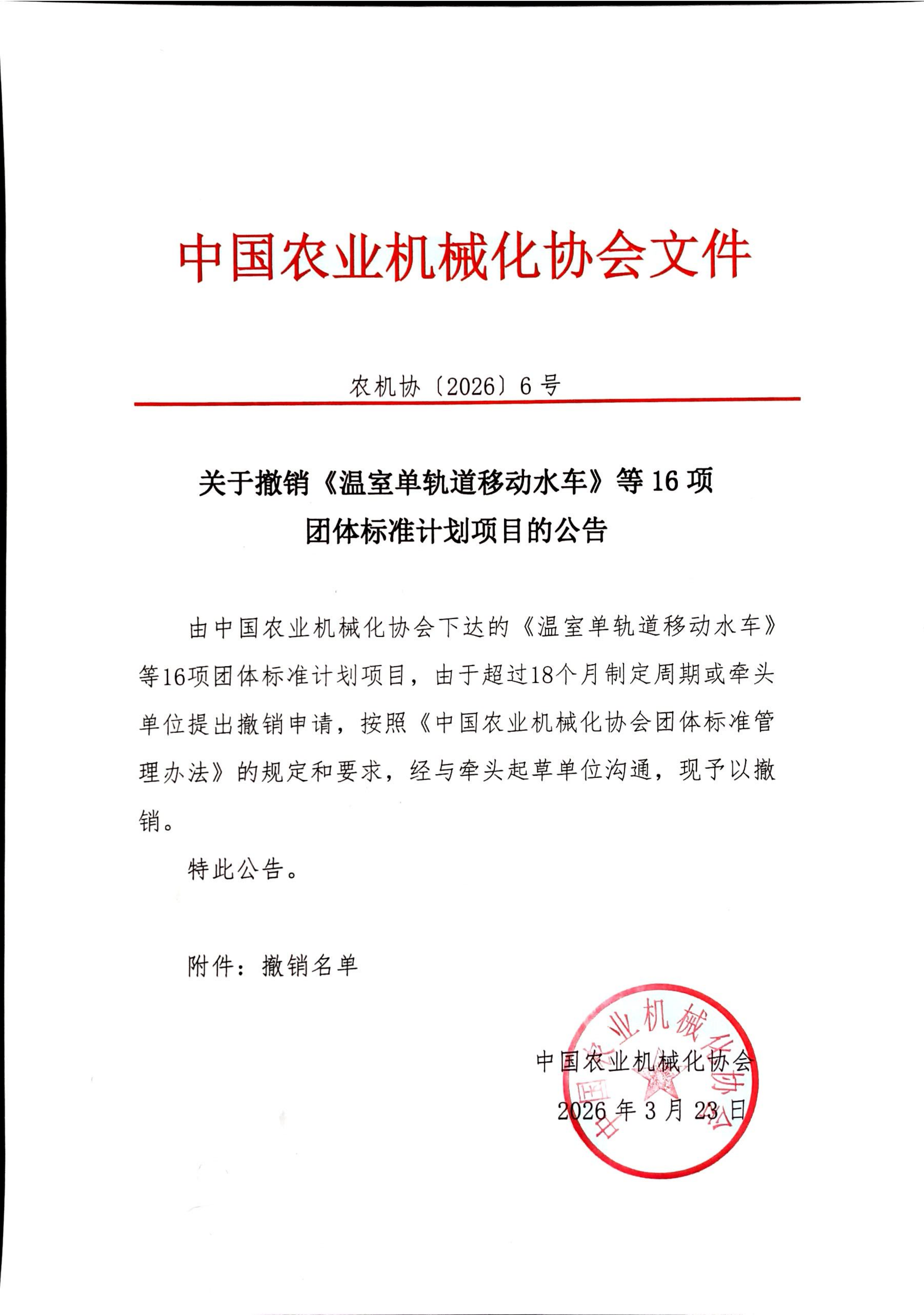 【通知】关于撤销《温室单轨道移动水车》等16项团体标准计划项目的公告