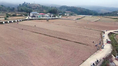 贵州省铜仁市石阡县聚凤乡廖家屯村的种植户们,在大豆收获后的田块上种植大蒜。
